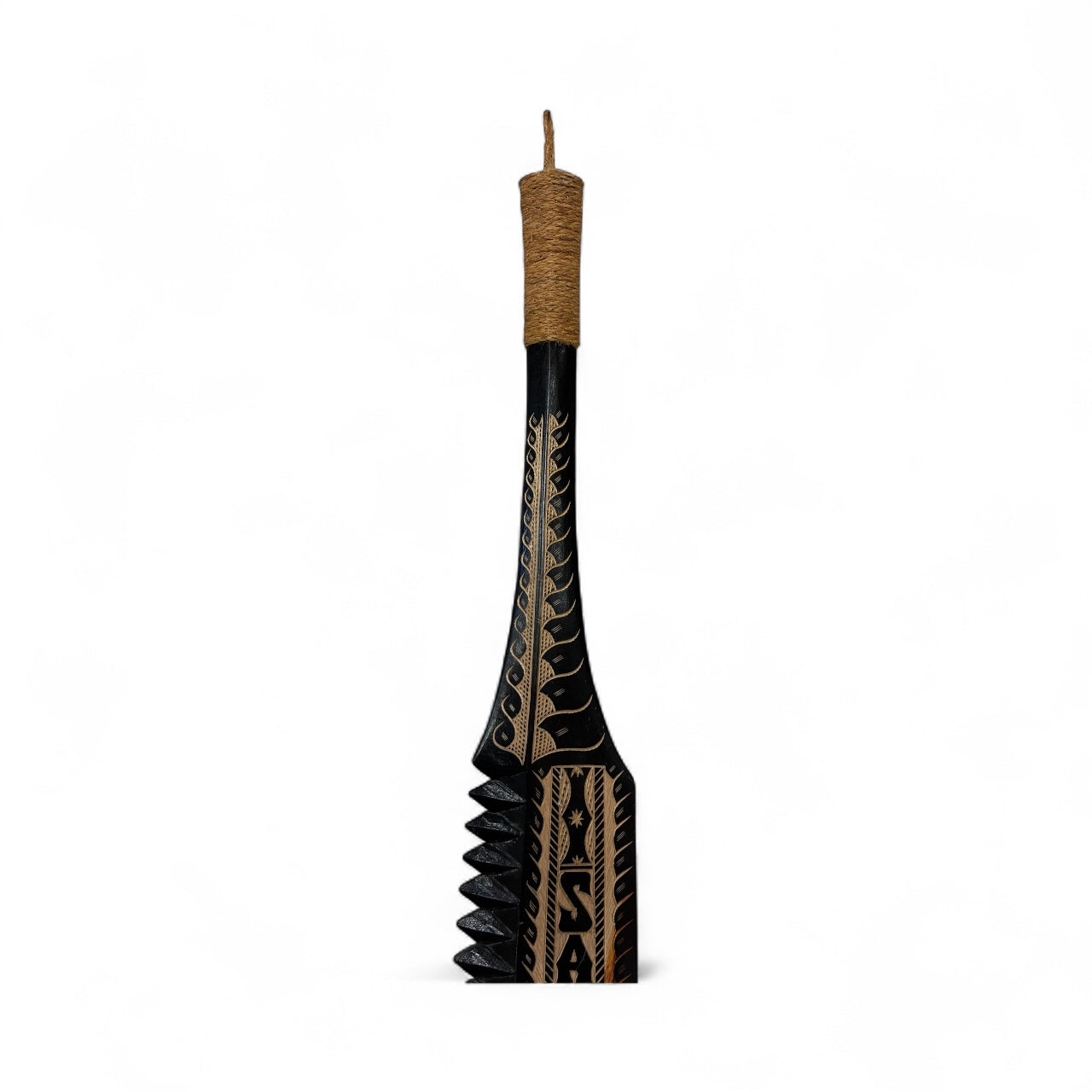 This 38-inch Nifo Oti (“tooth of death” in Samoan) is a stunning tribute to the artistry and warrior spirit of Samoa. Hand-crafted from durable hardwood and polished to a deep ebony finish, it features authentic Samoan tattoo motifs, serrated edges, and the word “SAMOA” boldly carved down the blade.